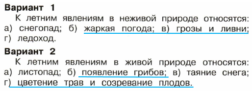 а) листопад; б) появление грибов; в) таяние снега; г) цветение трав и созревание плодов.