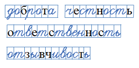 3. Муравью Вопросику очень интересно, что люди относят к лучшим человеческим качествам. С помощью учебника впиши в клеточки нужные слова и объясни Муравьишке, как ты их понимаешь.
