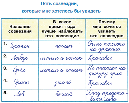 5. Выполняем задание Мудрой Черепахи – любительницы астрономии. С помощью атласа – определителя "От земли до неба" заполняем таблицу.