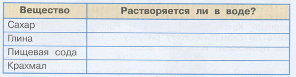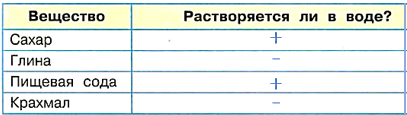 5. С помощью опытов определи, растворяются ли в воде эти вещества. Отметь знаком "+" (растворяется) или знаком "-" (не растворяется).