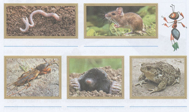 2. Среди знакомых Муравья Вопросика немало животных, обитающих в почве. В подземных галереях своего дома – муравейника – он развесил портреты друзей. Подпиши их (самостоятельно или с помощью учебника).