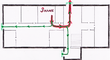 На моей схеме я показал(а) все возможные пути эвакуации из моего класса на случай пожара или другой опасности. Их всего три. Они обозначены стрелками зелёного цвета. Самый короткий путь эвакуации обозначен стрелками ещё и красного цвета.