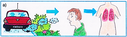 1) а) В этом случае человек дышит выхлопными газами автомобиля, его лёгкие загрязняются, наступает болезнь.