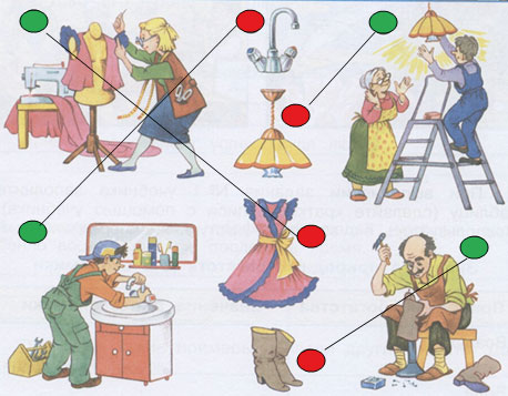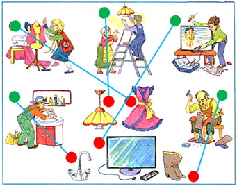 6. А это задание придумал папа Серёжи и Нади. Рассмотри рисунки. Отметь (закрась кружок) товары красным карандашом, а услуги зелёным. Составь пары, соединив линией товар и услугу.