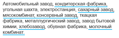 Автомобильный завод, кондитерская фабрика, угольная шахта, электростанция, сахарный завод, мясокомбинат, консервный завод, ткацкая фабрика, металлургический завод, завод бытовой химии, хлебозавод, обувная фабрика, молочный комбинат.
