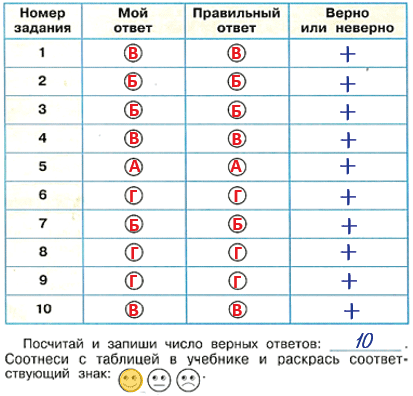 Выполняем задания учебника на с. 150 – 155. При выполнении заданий заполняем таблицу. В столбце "Мой ответ" записываем ту букву, которая, на наш взгляд, соответствует правильному ответу. В столбце "Правильный ответ" записываем буквы так, как показано на "Страничках для самопроверки". Сравниваем эти два столбца и заполняем третий: если наш ответ правильный, ставим знак "+", если неправильный – знак "–".