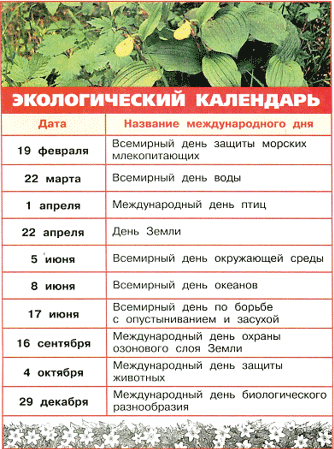 6. Изготовь для себя "Экологический календарь". Вырежи его из Приложения и наклей на плотную бумагу. Объясни, как ты понимаешь смысл международного дня. Если потребуется, обратись к дополнительной литературе, Интернету. Используй этот календарь при подготовке в классе различных экологических мероприятий.