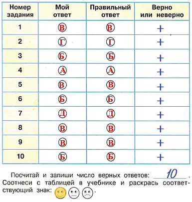 Выполняем задания учебника на с. 146 – 148. При выполнении заданий заполняем таблицу. В столбце "Мой ответ" записываем ту букву, которая, на наш взгляд, соответствует правильному ответу. В столбце "Правильный ответ" записываем буквы так, как показано на "Страничках для самопроверки". Сравниваем эти два столбца и заполняем третий: если наш ответ правильный , ставим знак "+", если неправильный – знак "_",