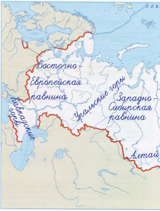 1. С помощью карты в учебнике (с. 58 – 59) подписываем на контурной карте (с. 30 – 31) крупнейшие равнины и горы нашей страны. Обращаем внимание, что на контурной карте даны пунктирные линии для подписей.