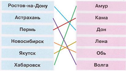 5. С помощью карты в учебнике определи, на каких реках стоят эти города. Соедини линиями названия городов и рек.