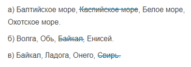 6. Зачёркиваем лишнее географическое название в каждом перечислении. Объсняем (устно) своё решение.