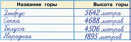 С помощью карты объясняем (устно), где находится каждая гора. Используя данные таблицы, сравниваем горы по высоте. Перечисляем горы в порядке увеличения их высоты; в порядке уменьшения их высоты.