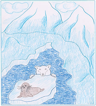 5. Смотрим плакат в конце тетради, который нарисовал папа Серёжи и Нади. Находим животных зоны арктических пустынь и подписываем их названия.