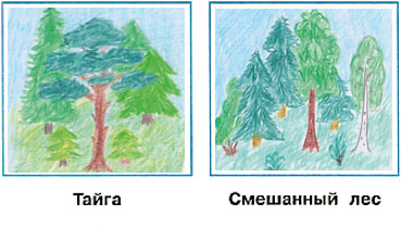 С помощью этих рисунков объясни (устно) различия тайги, смешанных и широколиственных лесов.
