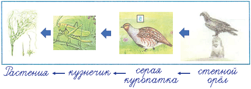 5. Составляем схему цепи питания, характерной для степной зоны. Сравниваем её со схемой, предложенной соседом по парте. С помощью этих схем рассказываем об экологических связях в зоне степей.