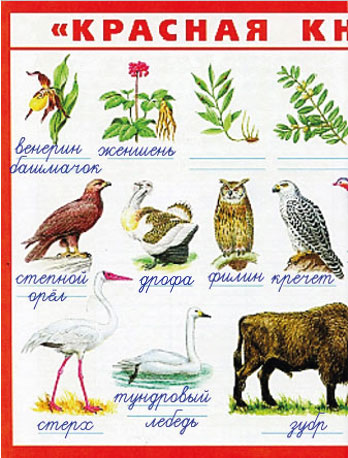 7. Продолжаем заполнение плаката "Красная книга России", который нарисовал папа Серёжи и Нади. Находим на плакате растение и животных степной зоны и подписываем их названия.
