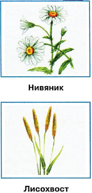 2. Вырезаем картинки растений луга из Приложения и располагаем их в соответствующих окошках. Проверяем себя по учебнику. После самопроверки наклеиваем картинки.