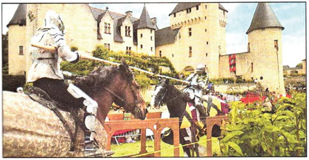 На фото красивейший рыцарский замок, возвышаю-щийся на холме. У подножия замка происходит мирная схватка между рыцарями. Мы видим тот самый момент, когда рыцари уже пытаются сбить ударом копья друг друга с лошади.