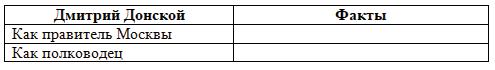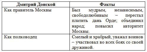 1. Какие качества отличали Дмитрия Донского как правителя Москвы и полководца? Подтверди фактами, в каких делах отразились эти качества.