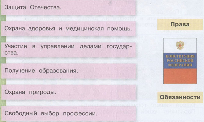 Называем, что из перечисленного относится к обязанностям, а что – к правам граждан Российской Федерации. Соединяем стрелками.