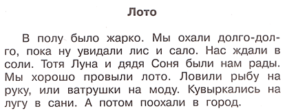 В поле было жарко. Мы ехали долго – долго, пока не увидели лес и село. Нас ждали в селе. Тётя Лена и дядя Сеня были нам рады. Мы хорошо провели лето. Ловили рыбу на реке, ели ватрушки на меду. Кувыркались на лугу в сене. А потом поехали в город.