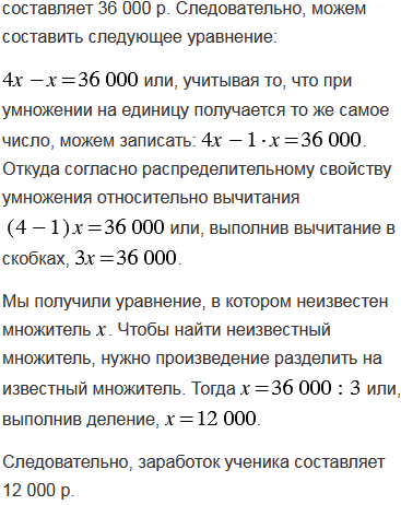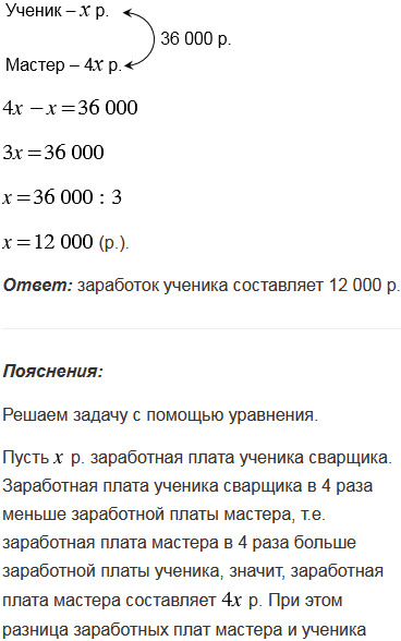 Заработная плата ученика сварщика в 4 раза меньше заработной платы мастера. Каков заработок ученика, если разница их заработных плат составляет 36 000 р.?