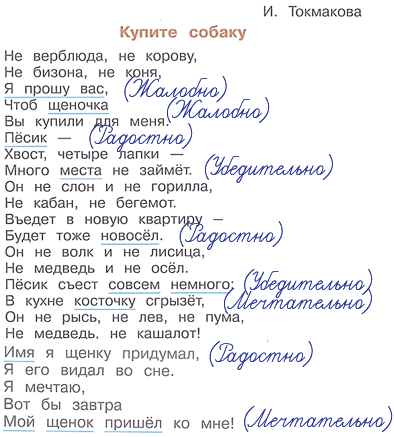 3. Прочитай текст так, чтобы передать желание мальчика иметь щенка. С какой интонацией надо читать стихотворение? Выдели голосом подчёркнутые слова.
