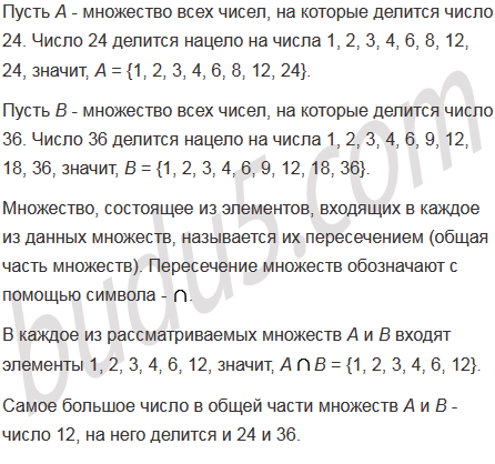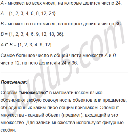 Найдите все числа, на которые делится число 24, и все числа, на которые делится число 36. Запишите общую часть этих множеств. Какое число самое большое в общей части множеств? Делятся ли на это число 24 и 36?