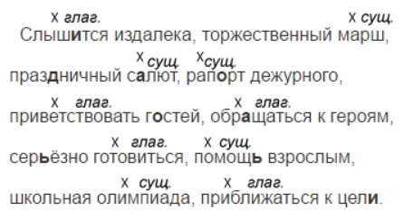 Слыш..тся издалека, торжественный марш, праз(?)ничный с..лют, рап..рт дежурного, приветствовать г..стей, обращаться к героям, сер(?)ёзно готовиться, помощ(?) взрослым, школьная олимпиада, приближаться к цел.. .