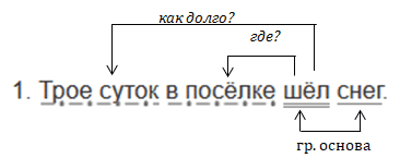 Это предложение повествовательное, невосклицательное, основа предложения - снег (подлежащее), шёл (сказуемое). В предложении есть второстепенные члены, поэтому оно распространённое. Шёл (где?) в посёлке - обстоятельство. Шёл (как долго?) трое суток - обстоятельство.