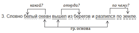 Это предложение повествовательное, невосклицательное, основа предложения - океан (подлежащее), вышел и разлился (сказуемые). В предложении есть второстепенные члены, поэтому оно распространённое. Вышел (откуда?) из берегов - обстоятельство. Разлился (по чему?) по земле - дополнение. Океан (какой?) белый - определение.
