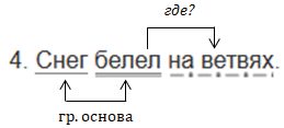 Это предложение повествовательное, невосклицательное, основа предложения - снег (подлежащее), белел (сказуемое). В предложении есть второстепенные члены, поэтому оно распространённое. Белел (где?) на ветвях - обстоятельство.