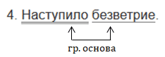 Это предложение повествовательное, невосклицательное, основа предложения - безветрие (подлежащее), наступило (сказуемое). В предложении нет второстепенных членов, поэтому оно нераспространённое.