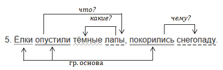 Это предложение повествовательное, невосклицательное, основа предложения - ёлки (подлежащее), однородные сказуемые - опустили, покорились. В предложении есть второстепенные члены, поэтому оно распространённое. Опустили (что?) лапы - дополнение. Покорились (чему?) снегопаду- дополнение. Лапы (какие?) тёмные - определение.