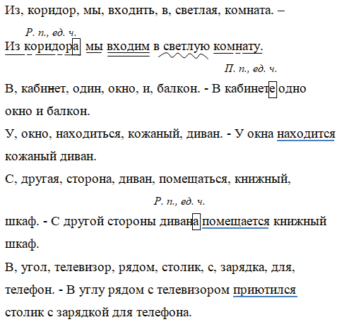 Составьте из данных слов предложения и запишите их. В трёх любых словах укажите окончания и их грамматические значения.