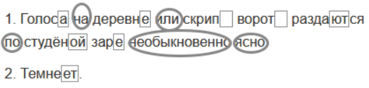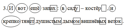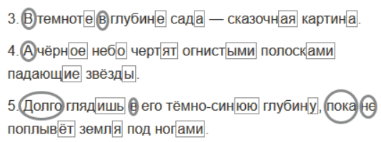 1. Голоса на деревне или скрип ворот раздаются по студёной заре необыкновенно ясно. 2. Темнеет. 3. И вот ещё запах: в саду — костёр, и крепко тянет душистым дымом вишнёвых веток. 3. В темноте в глубине сада — сказоч(?)ная картина. 4. А ч..рное небо чертят огнистыми полосками падающие звёзды. 5. Долго глядишь в его тёмно-синюю глубину, пока не поплывёт земля под ногами.