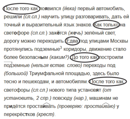 1. По...вился первый автомобиль. Р...шили научить улицу разговаривать, дать ей точный и выр..зительный язык знаков. 2. На свет..форе заж..гся зелёный свет. Дорогу можно переходить. 3. Под улицами Москвы прот..нулись подземные3 коридоры. Движение стало более безопасн..м. 4. Построили (под)земные переходы (под)Триумфальной площадью. Здесь было тесно и пешеходам, и автомобилям. 5. Свет..форы нового типа установ..т (по)всюду. Машинам не пр..дётся проста..вать у перекрёс(?)ков.