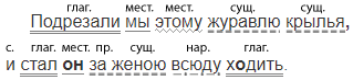 1. Раз мы поймали м..лодого журавля и дали журавлю лягушку. Журавль лягушку прогл..тил. Дали другую третью3 четвёртую пятую — прогл..тил. 2. Подрезали мы этому журавлю крылья и стал журавль за женою всюду х..дить.4 3. Жена корову д..ить — и Журка с женой, и в огород за женой, и на п..левые работы ходит с женой, и за водой. 4. Пр..выкла к журавлю жена, и без журавля жене уж скучно, без журавля никуда. 5. Крикн..т: «Фру-фру!», журавль к жене б..жит. Такой умница!