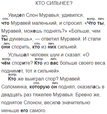 Увид..л Слон Муравья, удивился, что Муравей маленький, и спросил: «Что ты, Муравей, мож..шь поднять?» «Больше, чем ты дума..шь», — ответил Муравей. И стали они спорить, кто из них сильней.