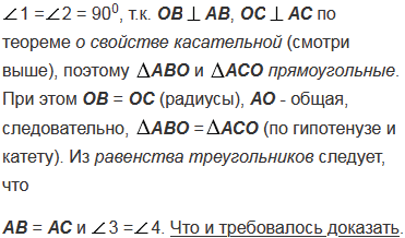 Докажите, что отрезки касательных к окружности, проведенные из одной точки, равны и составляют равные углы с прямой, проходящей через эту точку и центр окружности.