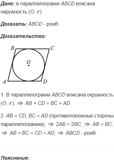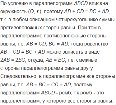 Докажите, что если в параллелограмм можно вписать окружность, то этот параллелограмм - ромб.