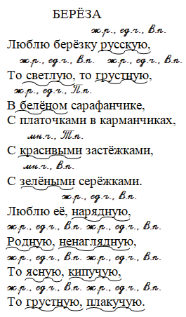 Прочитайте стихотворение. Какие прилагательные помогают поэту ярко, образно нарисовать берёзу? Спишите, подчеркните прилагательные. Обозначьте их род, падеж и число. Подберите синонимы к слову грустный. Найдите прилагательные, с помощью которых берёза описана как живое существо.
