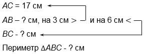 Найдите периметр треугольника АВС, если АС = 17 см, а сторона АВ меньше стороны ВС на 6 см и больше стороны АС на 3 см.