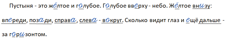 Пустыня - это ж_лтое и г_лубое. Г_лубое вв_рху - небо. Ж_лтое вн_зу: вп_реди, поз_ди, справ_, слев_ - в_круг. Сколько видит глаз и _щё дальше - за г_р_зонтом.