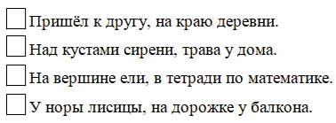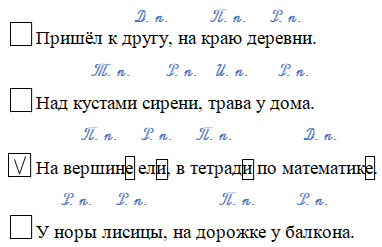 Чтобы доказать, что вы верно определили падеж имён существительных, задайте к ним вопрос: пришёл (к кому?) к другу, на краю (чего?) деревни, (над чем?) над кустами, над кустами (чего?) сирени, (что?) трава, трава (у чего?) у дома, (на чём?) на вершине, на вершине (чего?) ели, (в чём?) в тетради, в тетради (по чему?) по математике, (у чего?) у норы, у норы (кого?) лисицы, (на чём?) на дорожке, на дорожке (у чего?) у балкона.