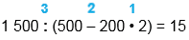 1) 200 • 2 = 400 2) 500 - 400 = 100 3) 1 500 : 100 = 15 |