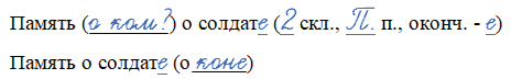 Память ( ___ ) о солдат__ ( __ скл., __ п., оконч. - __ )