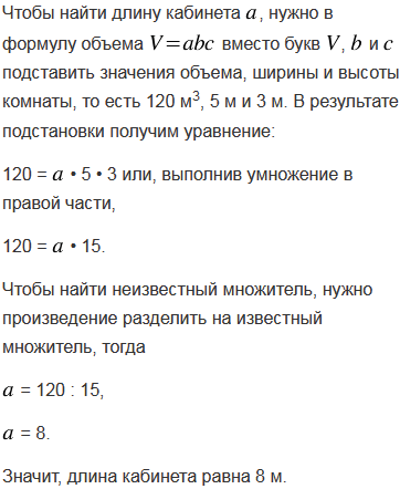 а) Объем кабинета математики равен 120 м3, высота 3 м, ширина - 5 м. Вычислите длину кабинета и площади пола, потолка и каждой стены.