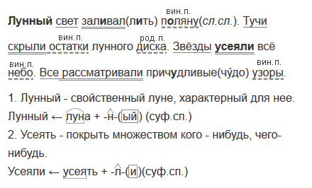 1) Лунный свет зал..вал п..ляну. 2) Тучи скрыли остатки лунного диска. 3) Звёзды усеяли всё небо. 4) Все рассматривали прич..дливые узоры.