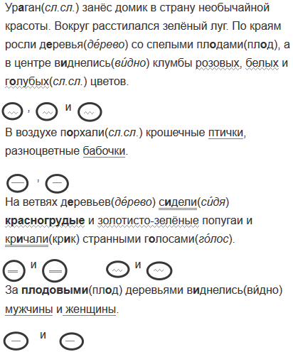 Ур..ган занёс домик в страну необычайной красоты. Вокруг расстилался зелёный луг. По краям росли д..ревья со спелыми пл..дами, а в центре в..днелись клумбы розовых белых и г..лубых цветов. В воздухе п..рхали крошечные птички разноцветные бабочки. На ветвях д..ревьев с..дели красногрудые и золотисто-зелёные попугаи и кр..чали странными г..лосами. За пл..довыми деревьями в..днелись мужчины и женщины. (По А. Волкову)